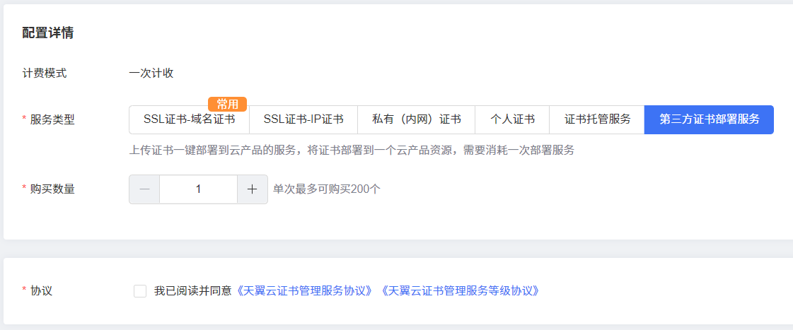 阅读并同意天翼云证书管理服务的服务协议和服务等级协议后,单击“立即购买”下单。