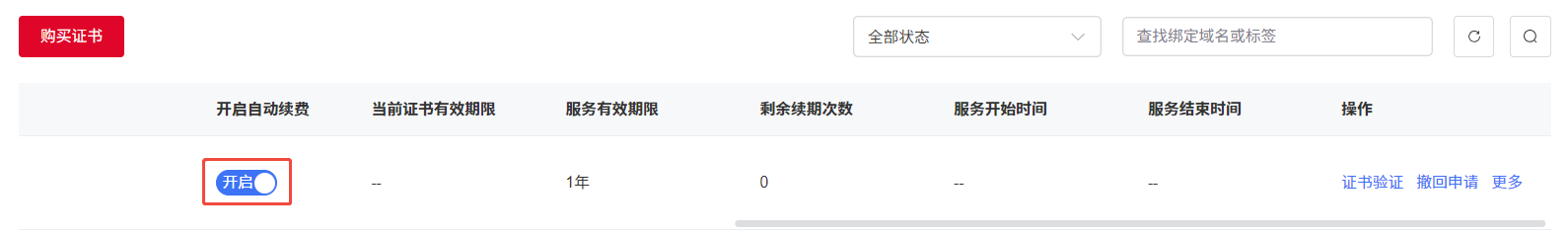 选择需要开启自动续订功能的证书,将“开启自动续费”开关调整至