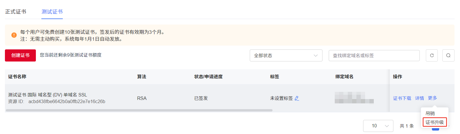 选择“测试证书”页签,在待升级的证书操作列,单击“证书升级”。
