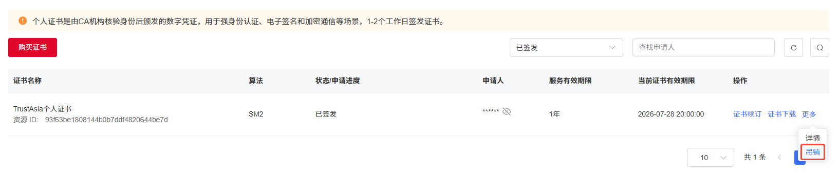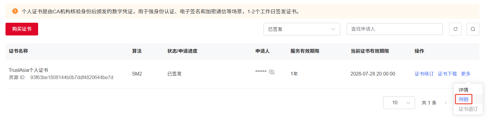 选择需要吊销的个人证书,选择“操作”列的“更多 > 吊销”。