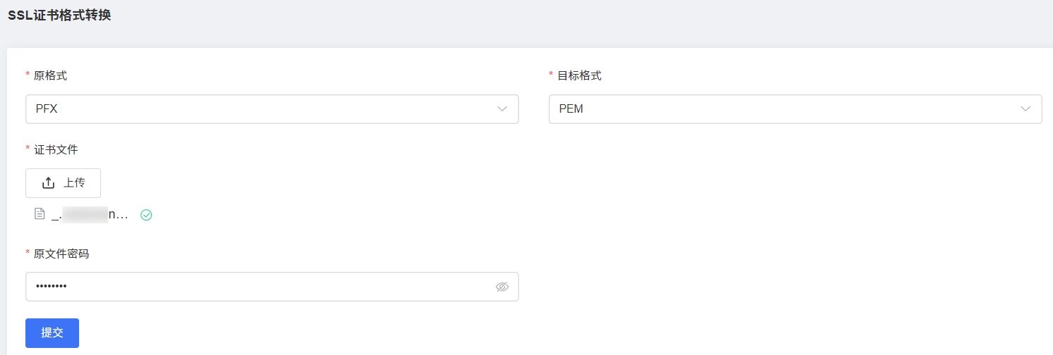选择原格式、目标格式,并上传原证书文件,非PEM格式的证书还需要填写文件密码。