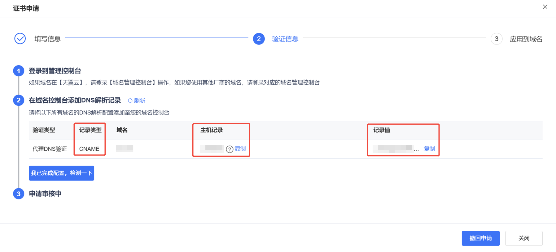 在证书验证页面,查看并记录解析记录的记录类型、主机记录和记录值。
