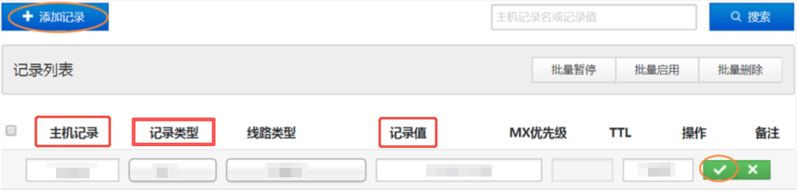 在添加记录面板,将域名认证获取到的验证信息进行添加,填写规则参见下表。