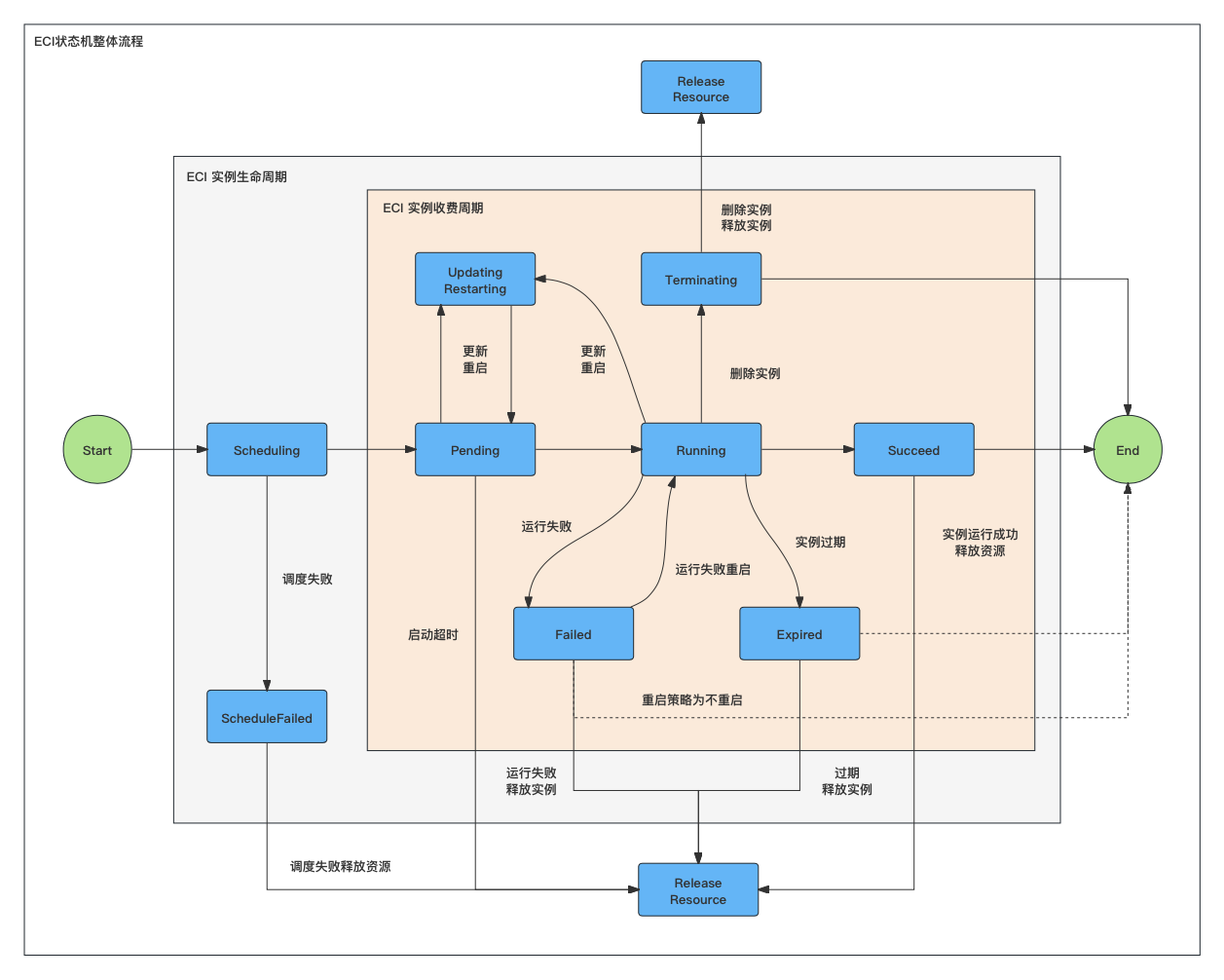 本文介绍ECI Pod(即ECI实例)的生命周期状态,您可以根据实例状态,设计和实现符合您业务逻辑的处理逻辑。