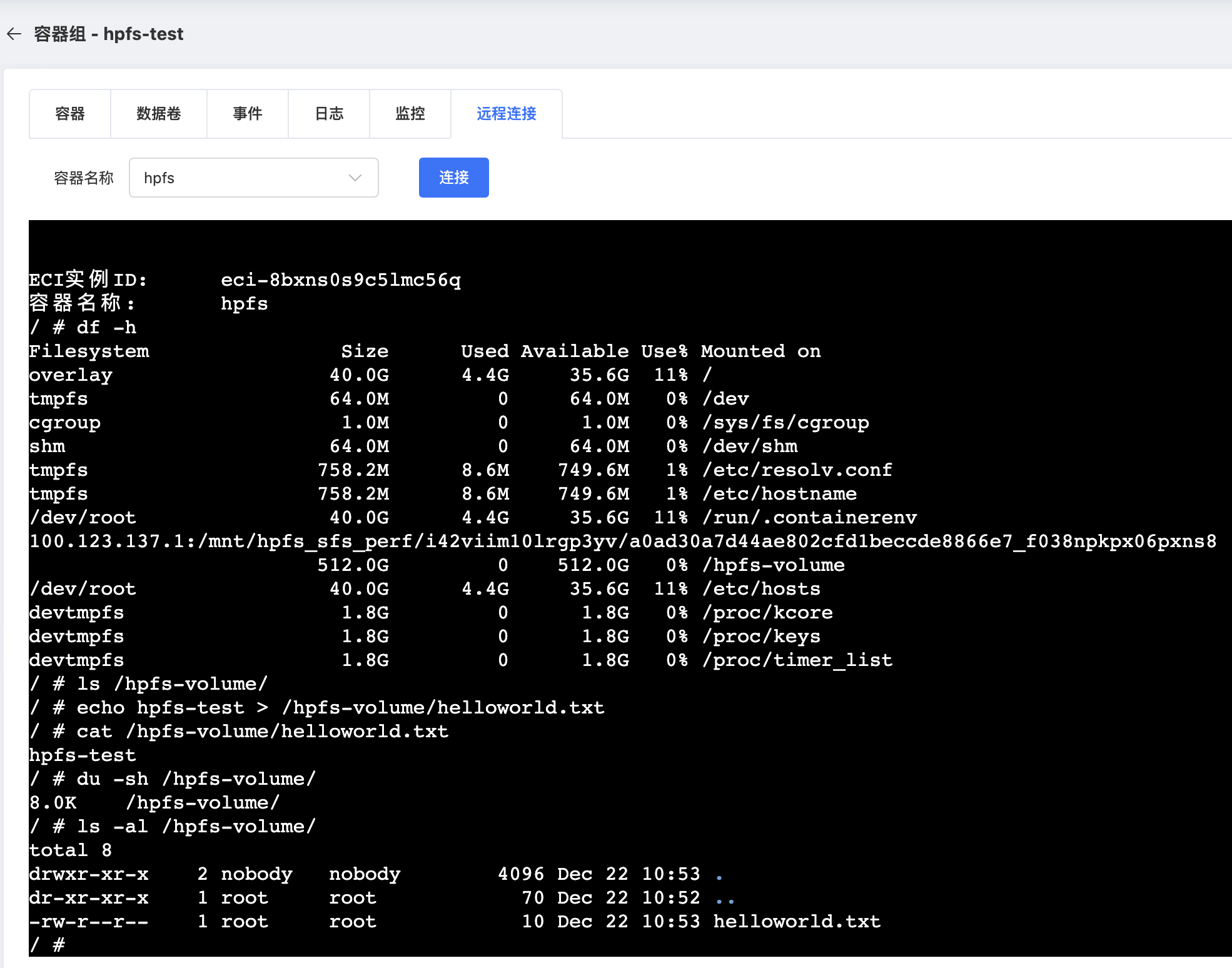 用户可以通过df -h命令查看已挂载的文件系统及挂载目录。如下图所示,我们为ECI实例挂载了一块512G大小的弹性文件,挂载目录为/hpfs-volume。