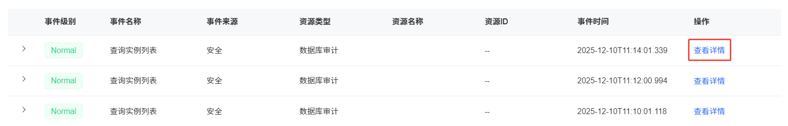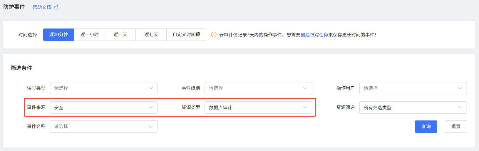 在事件列表中,上方时间选择需要筛选的时间段,筛选条件选择事件来源为“安全”,资源类型选择“数据库审计”,单击“查询”即可。