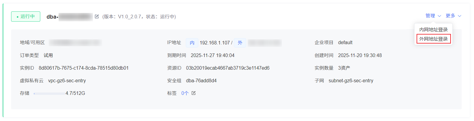 找到需要登录的实例,单击“管理 > 外网地址登录”。