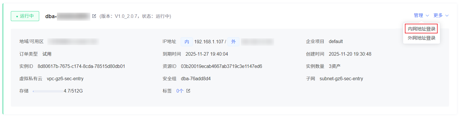 找到需要登录的实例,单击“管理 > 内网地址登录”。