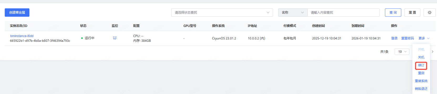 3.支付完成后,可在订单中查看到订单的状态,若续订成功,可在控制台裸金属实例列表中看到该实例到期时间的变化。