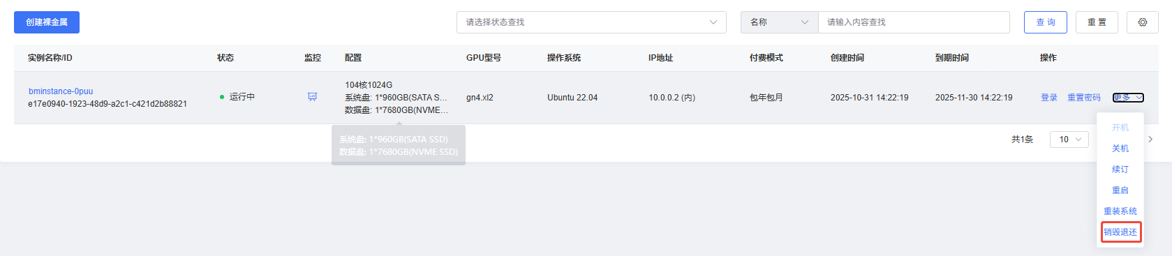 点击列表的更多,点击【销毁退还】按钮,执行删除操作。