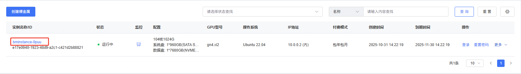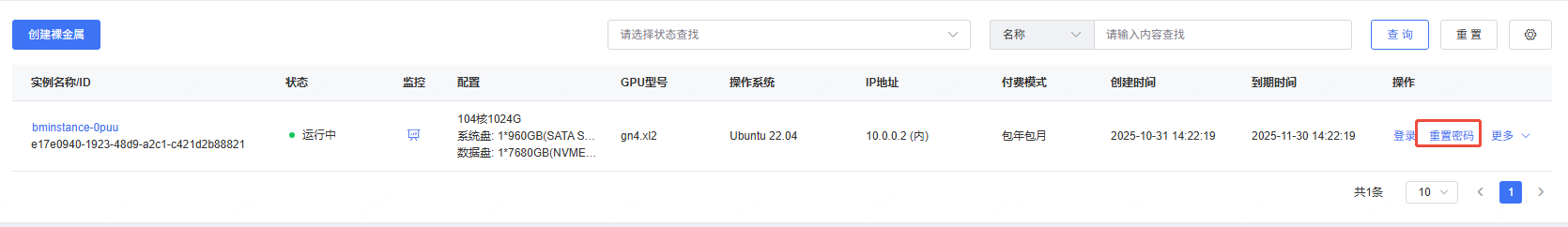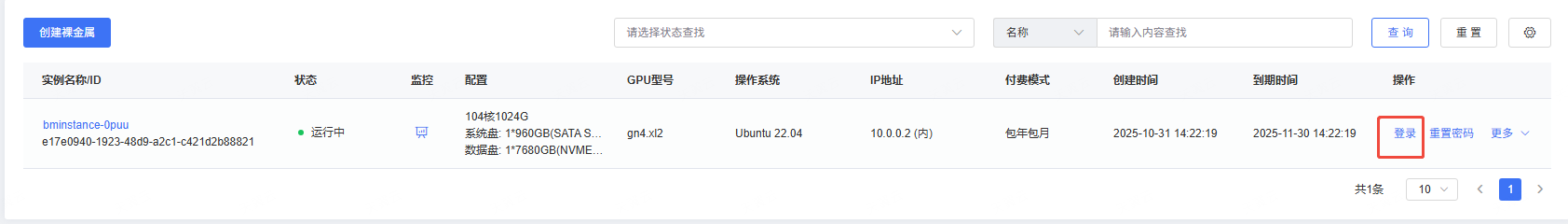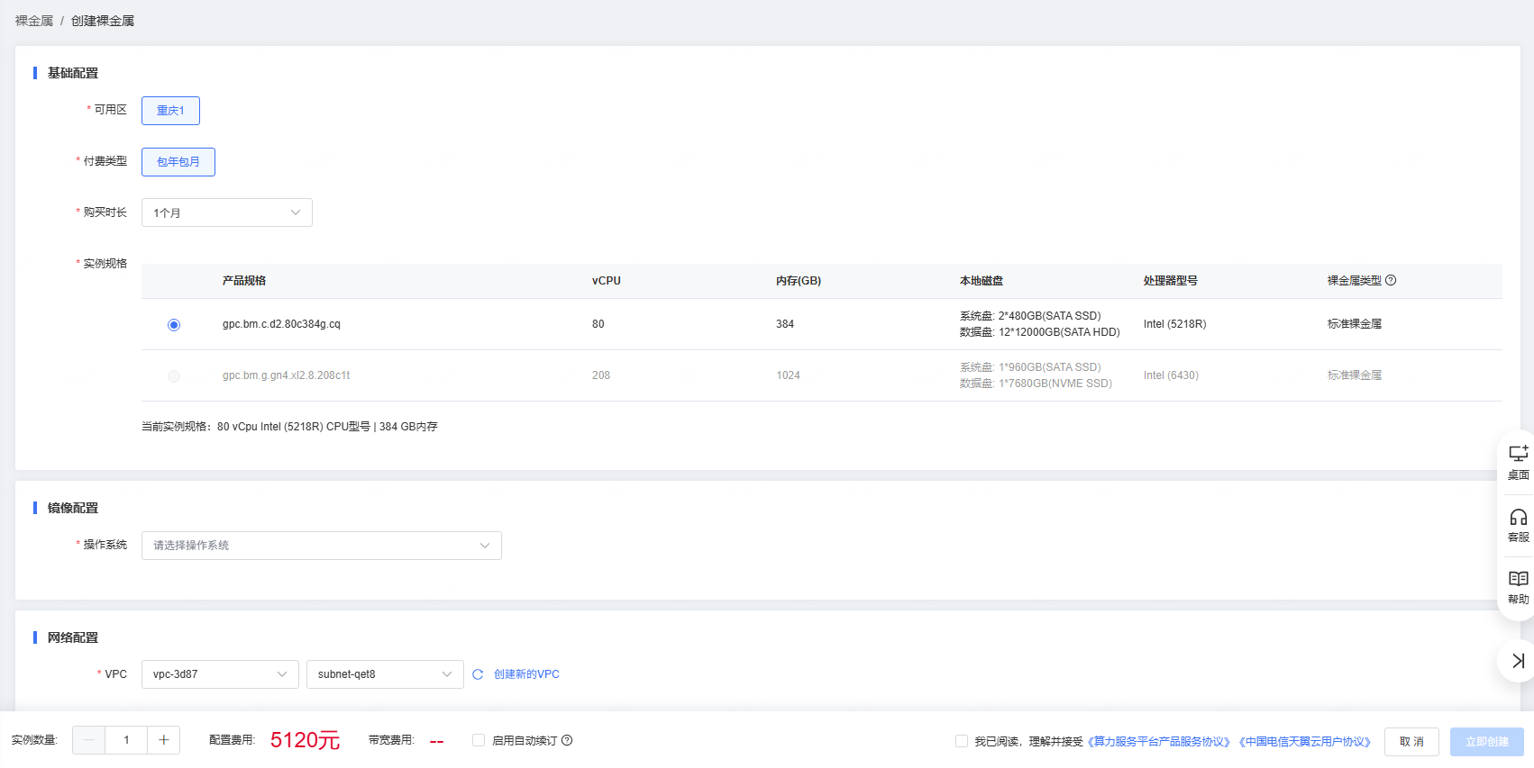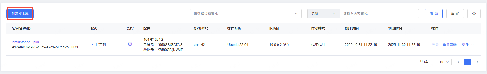 单击左侧导航栏的【计算>裸金属】,点击左上角【创建裸金属】。
