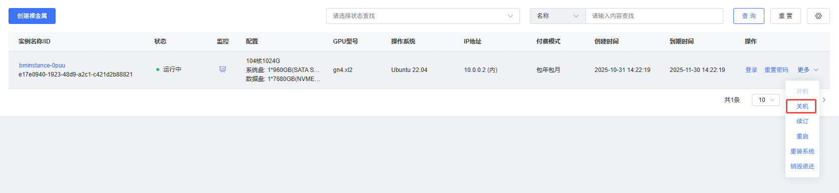 点击列表的更多,点击【开机】或【关机】按钮,执行开/关机操作。已关机状态下可操作开机,运行中状态可操作关机。