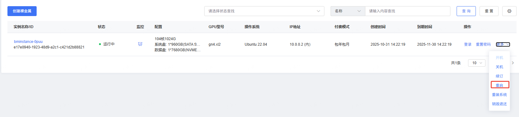 点击列表的更多,点击【重启】按钮,执行重启操作。