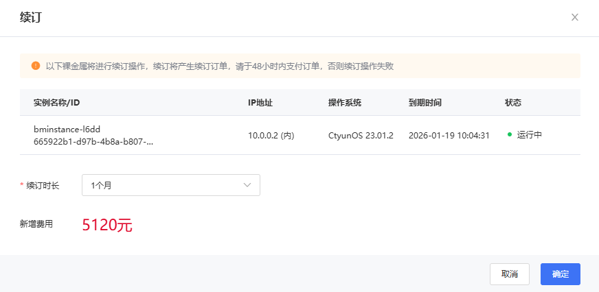 2.出现弹窗,用户可基于实际需求选择续订时长,系统会自动计算并显示对应的新增费用,点击【确定】进入续订订单的支付流程。