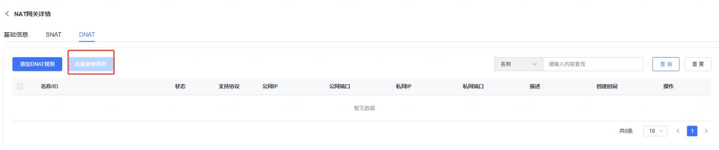 单击【DNAT】页签,选择需要删除的DNAT规则,单击上方的【批量删除规则】,弹窗提示点击【确认】,即可删除DNAT规则,删除后立即生效,对应子网无法通过DNAT访问公网。