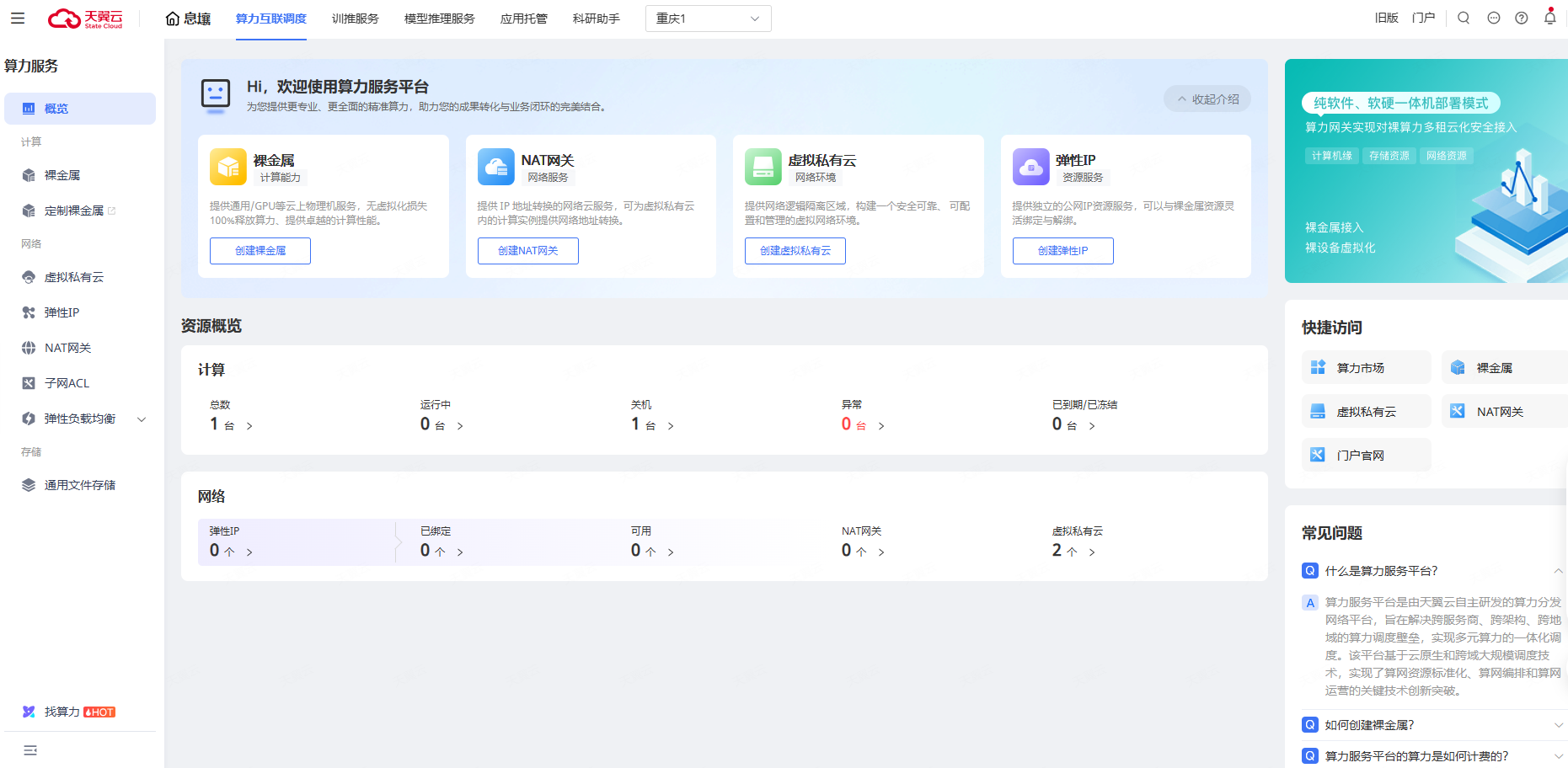 概览用于查看用户整体的裸金属、NAT网关、虚拟私有云、弹性IP、息壤智算集群情况,提供各子页面的快速入口与常见问题解答。