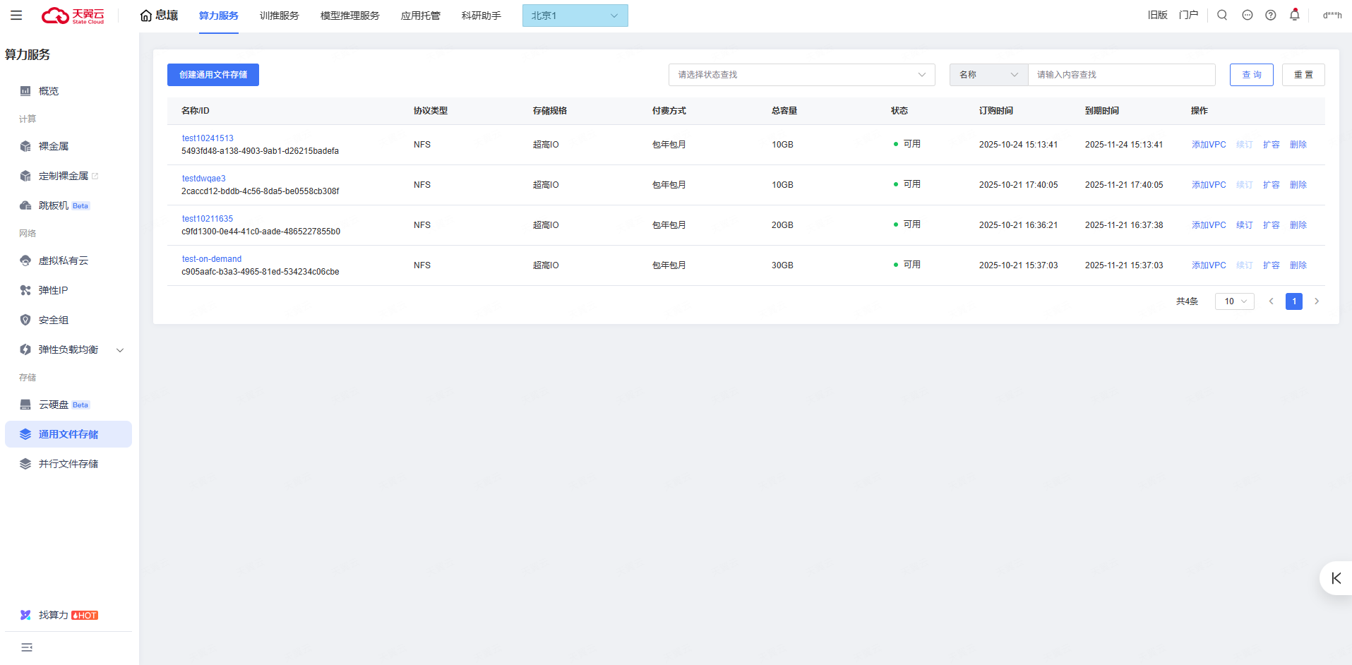 选择"存储>通用文件存储"进入通用文件存储控制台页面,在通用文件存储列表处找到需要进行续订的目标文件存储。