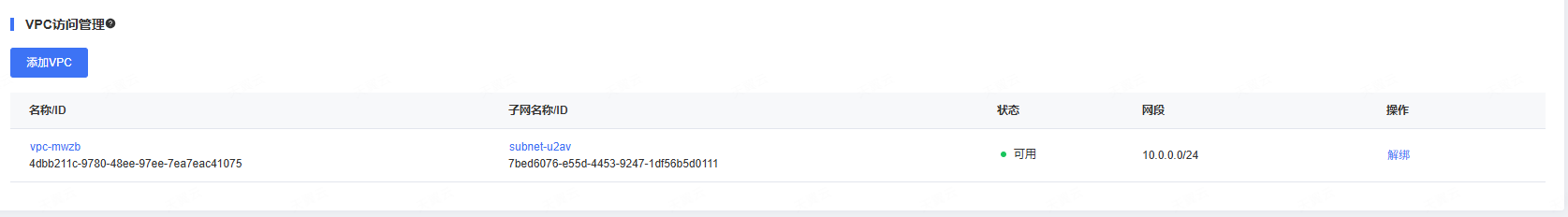 创建完通用文件存储之后,可以点击操作列表中-添加VPC。