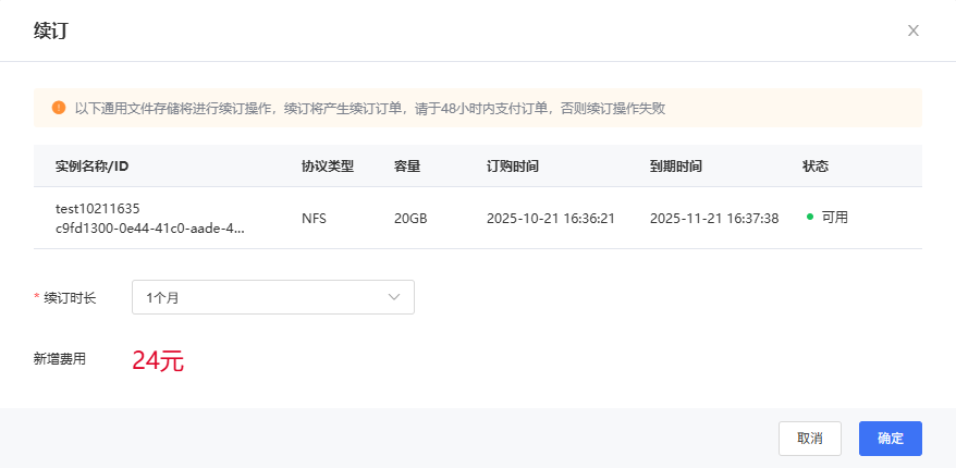 可在通用文件存储控制台完成在线续订操作,操作步骤如下: