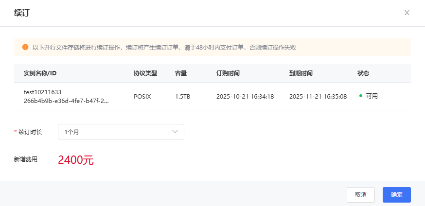 可在并行文件存储控制台完成在线续订操作,操作步骤如下: