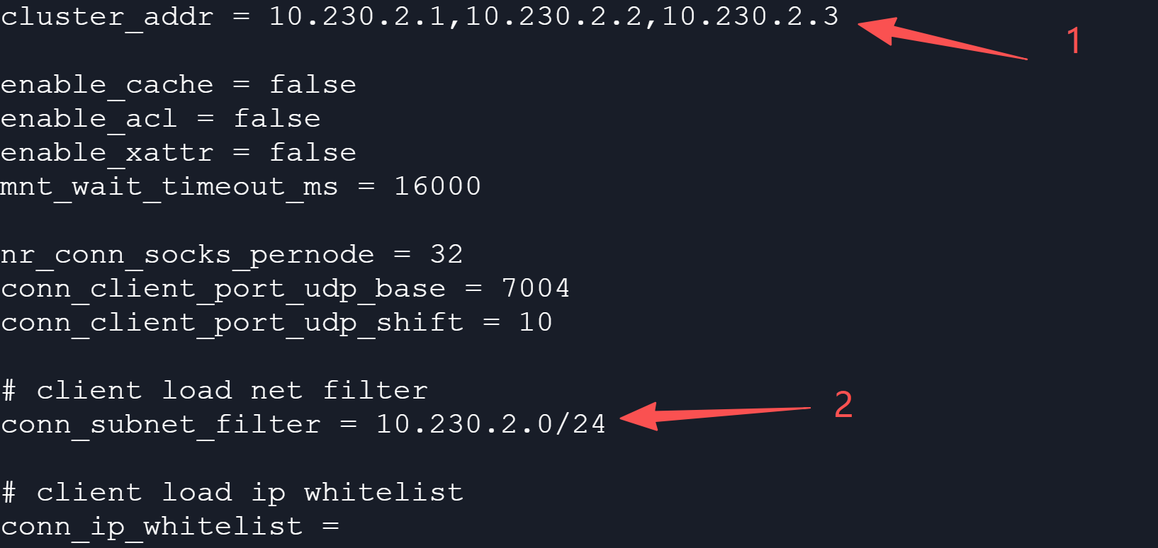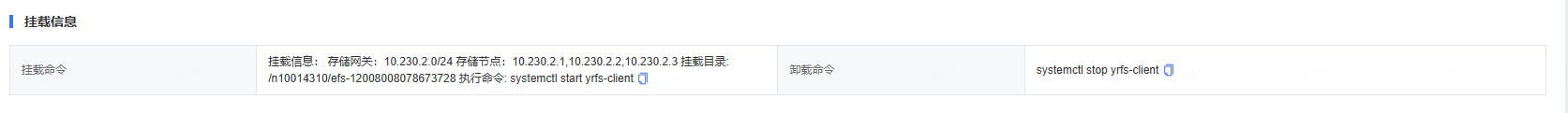 vim /etc/yrfs/yrfs-client.conf 在cluster_addr及conn_subnet_filter中分别填入挂载信息中的存储节点及存储网关地址: