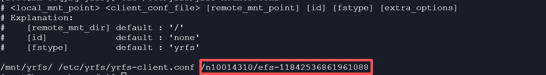vim /etc/yrfs/yrfs-mounts.conf在/etc/yrfs/yrfs-mounts.conf后面填入挂载信息中的挂载目录:
