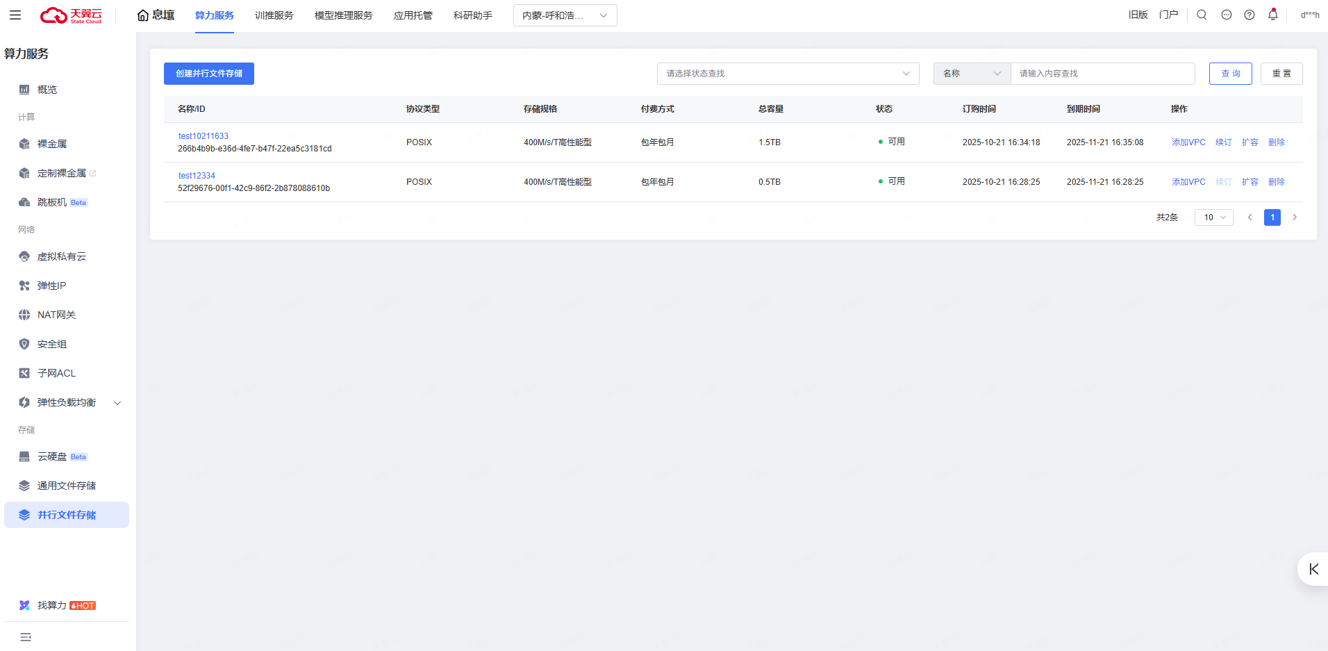 选择“存储>并行文件存储”,进入并行文件存储列表页面。