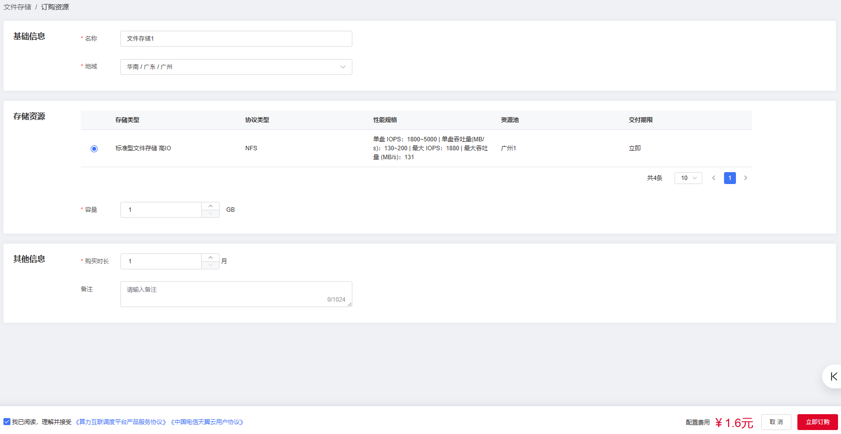 | 容量 | 填写订购存储资源的数量。 |
