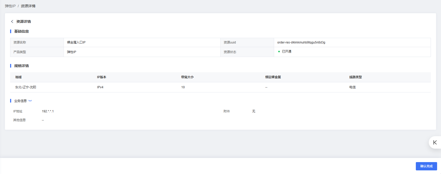 通过业务信息可查看弹性IP的IP地址等信息,根据这些信息验证弹性IP是否可用,确认可用后点击【确认完成】即可完成弹性IP订购。
