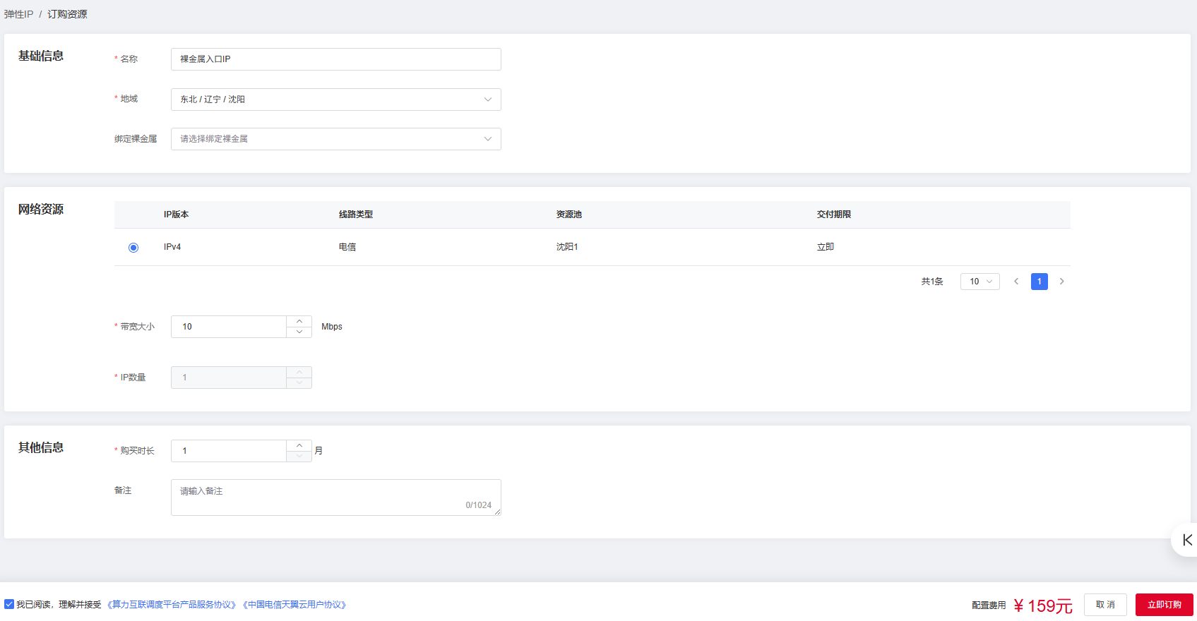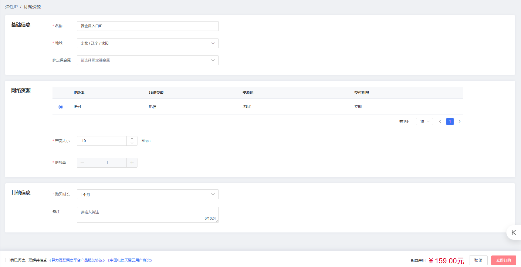 勾选协议,点击【立即订购】提交订单,订单提交后,按提示完成支付后进入交付环节。