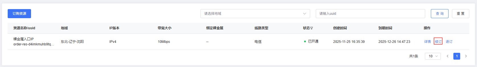 在弹性IP列表页面中,选择目标资源并单击右侧【续订】。