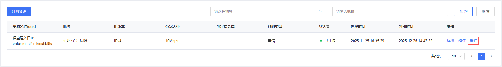 在弹性IP列表页面中,选择目标资源并单击右侧【退订】。