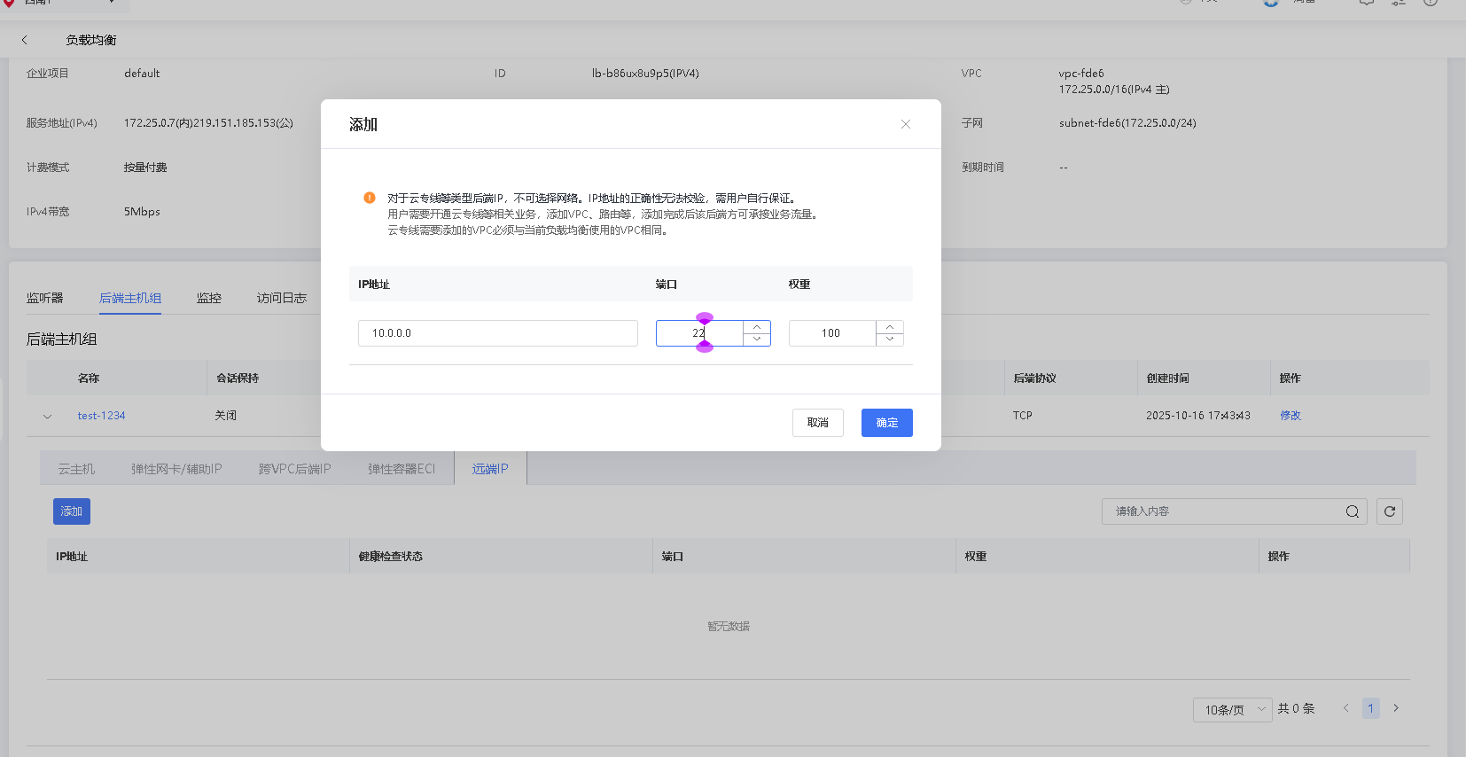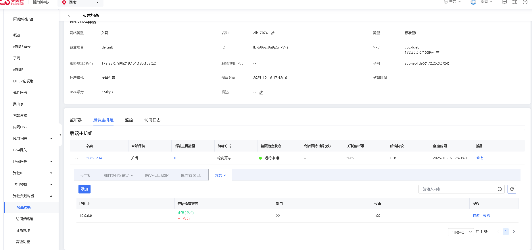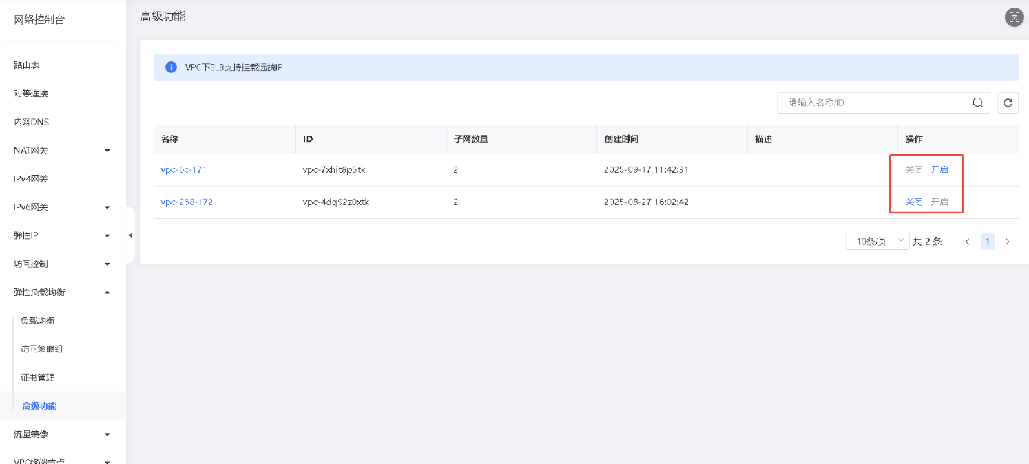 选择天翼云4.0侧的弹性负载均衡器下的高级功能,选择ELB所关联的VPC旁的“开启”。功能启用后,对应VPC绑定的ELB主机组中添加主机的时候,可添加远端的IP(算力网关侧)。
