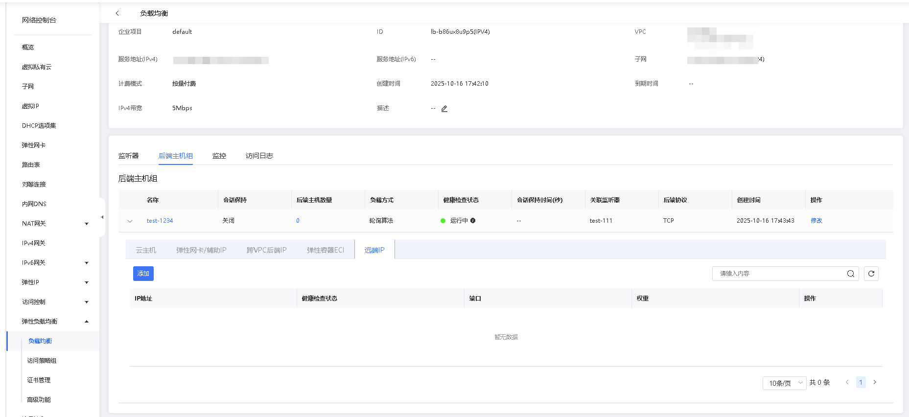 选择ELB的详情页,进入“后端主机组”标签页,选择“远端IP”子标签页,并点击“添加”按钮。