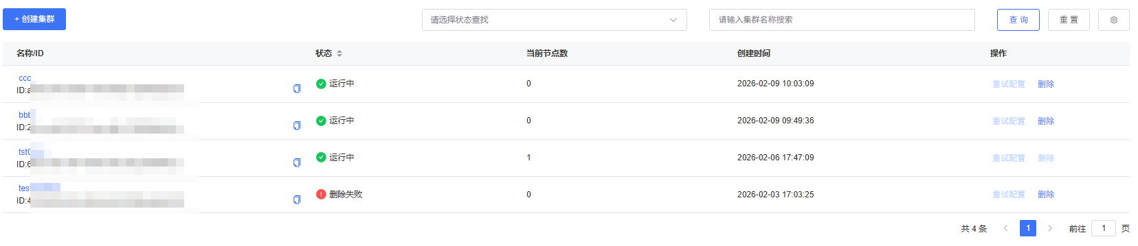 单击左侧导航栏的【集群>裸金属集群】,集群列表页可以查看已创建的裸金属集群信息。