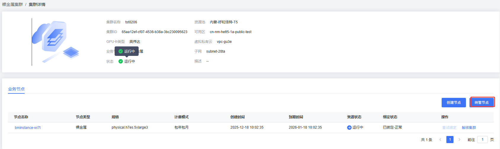 在指定裸金属详情中,纳管已购裸金属节点并加入裸金属集群。