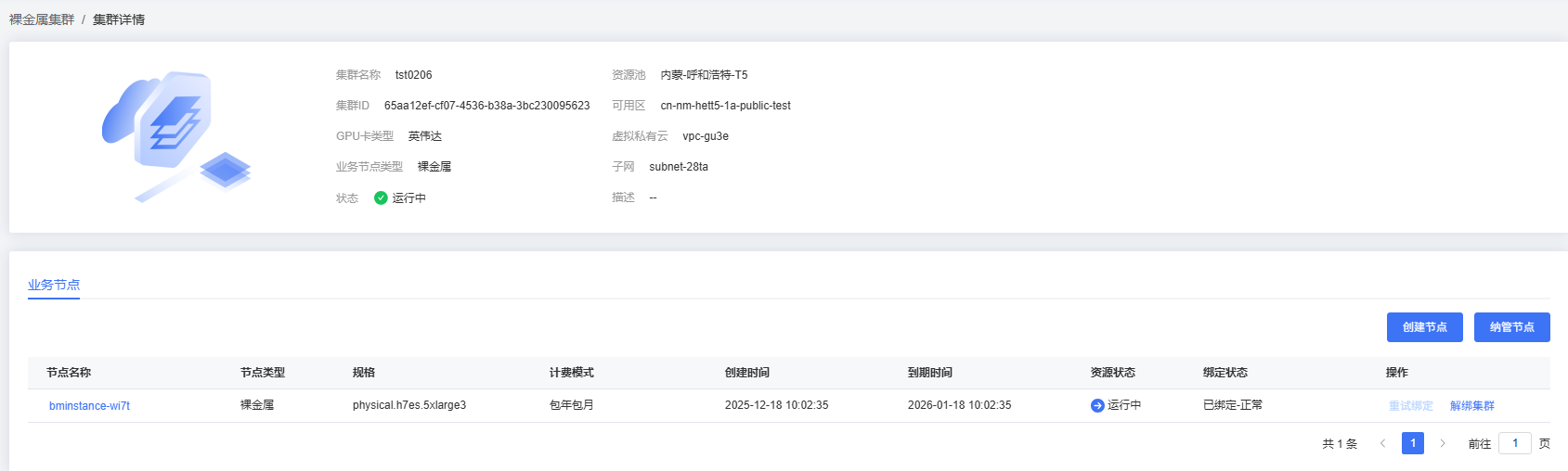 在裸金属集群详情页,可以查看基本信息、业务节点信息、集群控制面板实例信息,并进行相关操作。