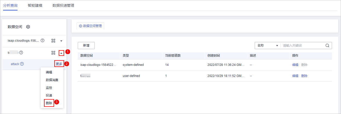 ,选择“安全 > 态势感知(专业版)”,进入态势感知(专业版)管理页面。在左侧导航栏选择“工作空间 > 空间管理”,并在工作空间列表中,单击目标工作空间名称,进入目标工作空间管理页面。