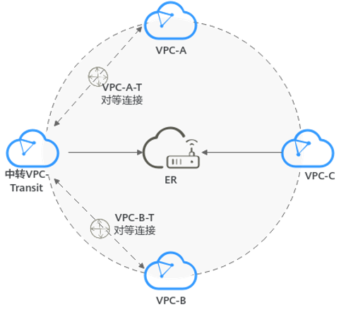 | 方案二 | 不直接将业务VPC-A和业务VPC-B接入企业路由器ER,而是创建一个中转VPC-Transit,将VPC-Transit和VPC-C接入ER中。 |