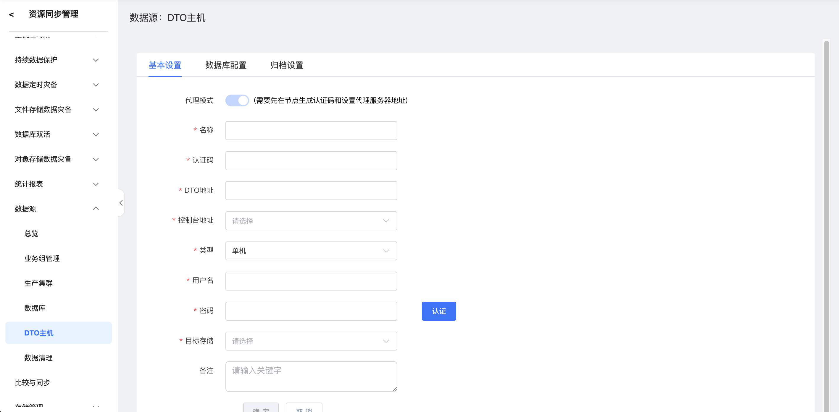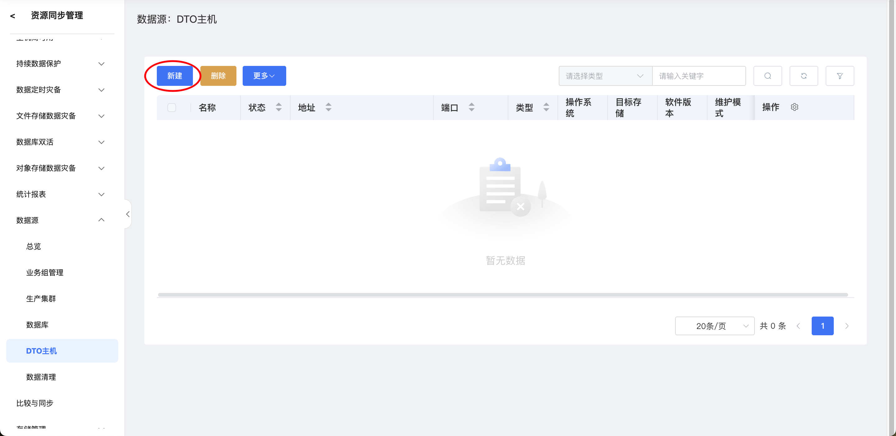 点击左侧菜单栏-“资源同步管理”-“数据源”-“DTO主机”,进入DTO主机页。单击“新建”按钮,进入DTO主机新建页面。