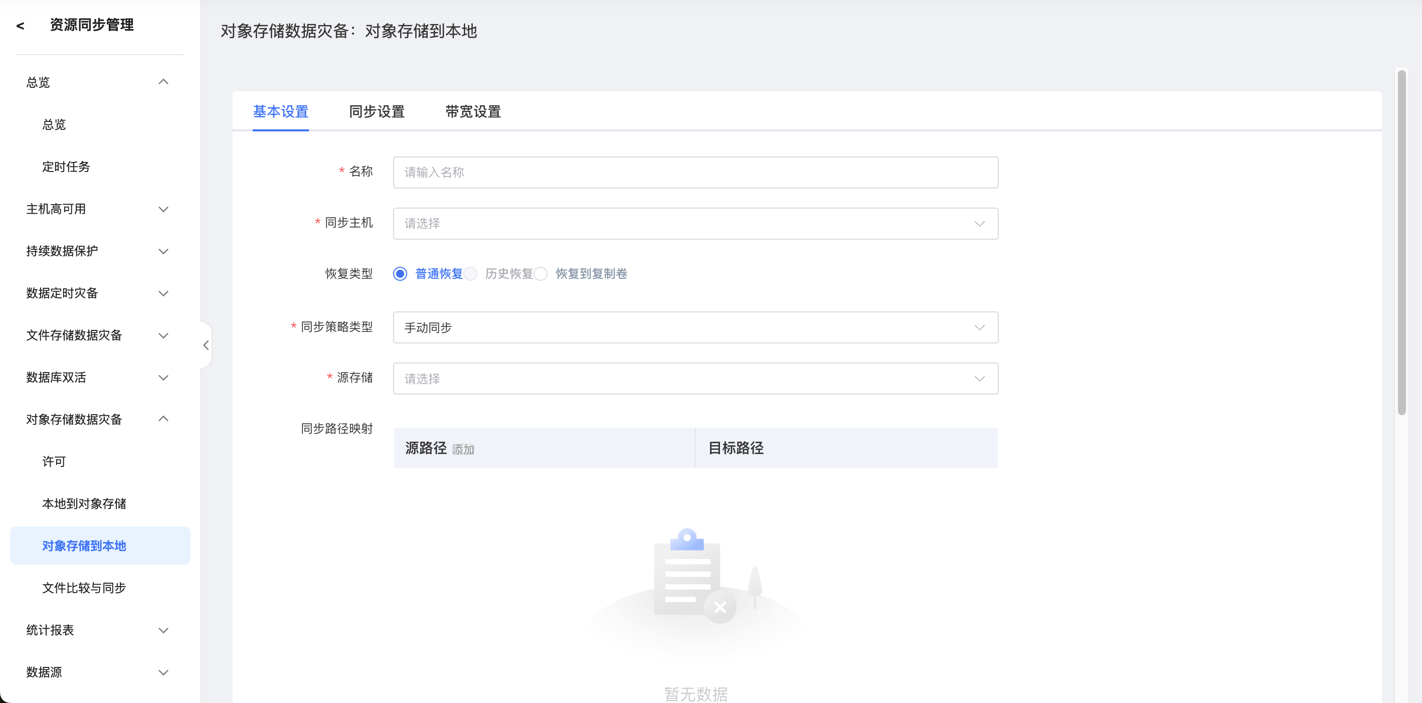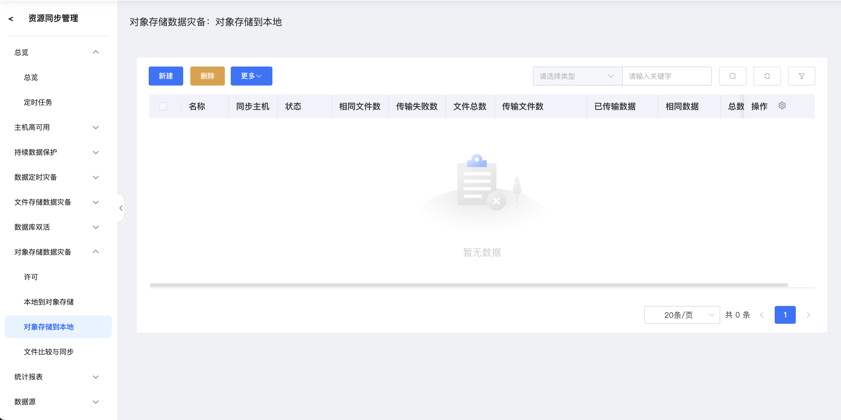点击左侧菜单栏-“资源同步管理”-“对象存储数据灾备”-“对象存储到本地”,进入对象存储到本地列表页,点击“新建”按钮,进入新建页面。