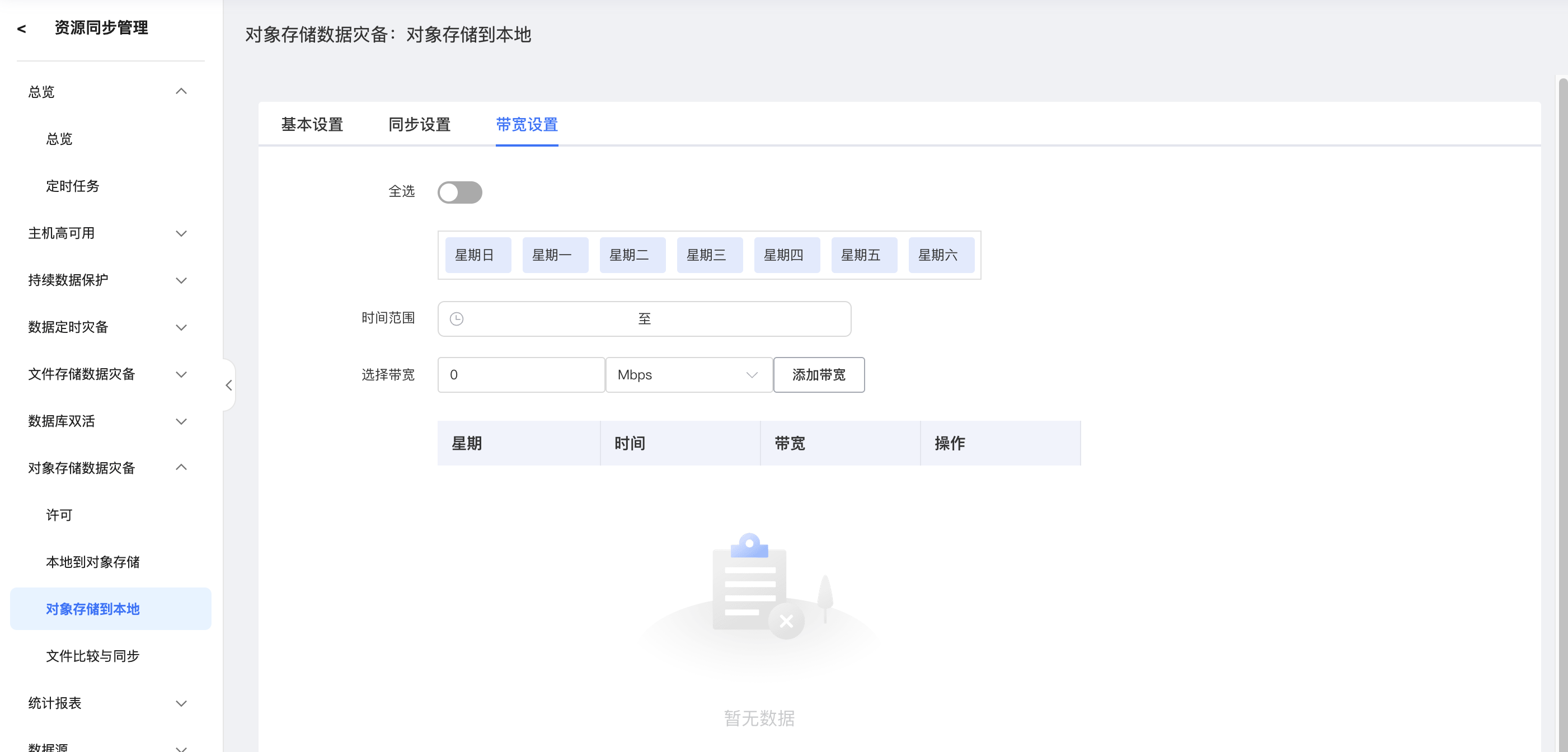 选择带宽:根据用户需求选择需要执行限速的时间段,可以设定多个不重叠的限速规则,彼此独立,如果带宽设定为0,表示禁止传输。