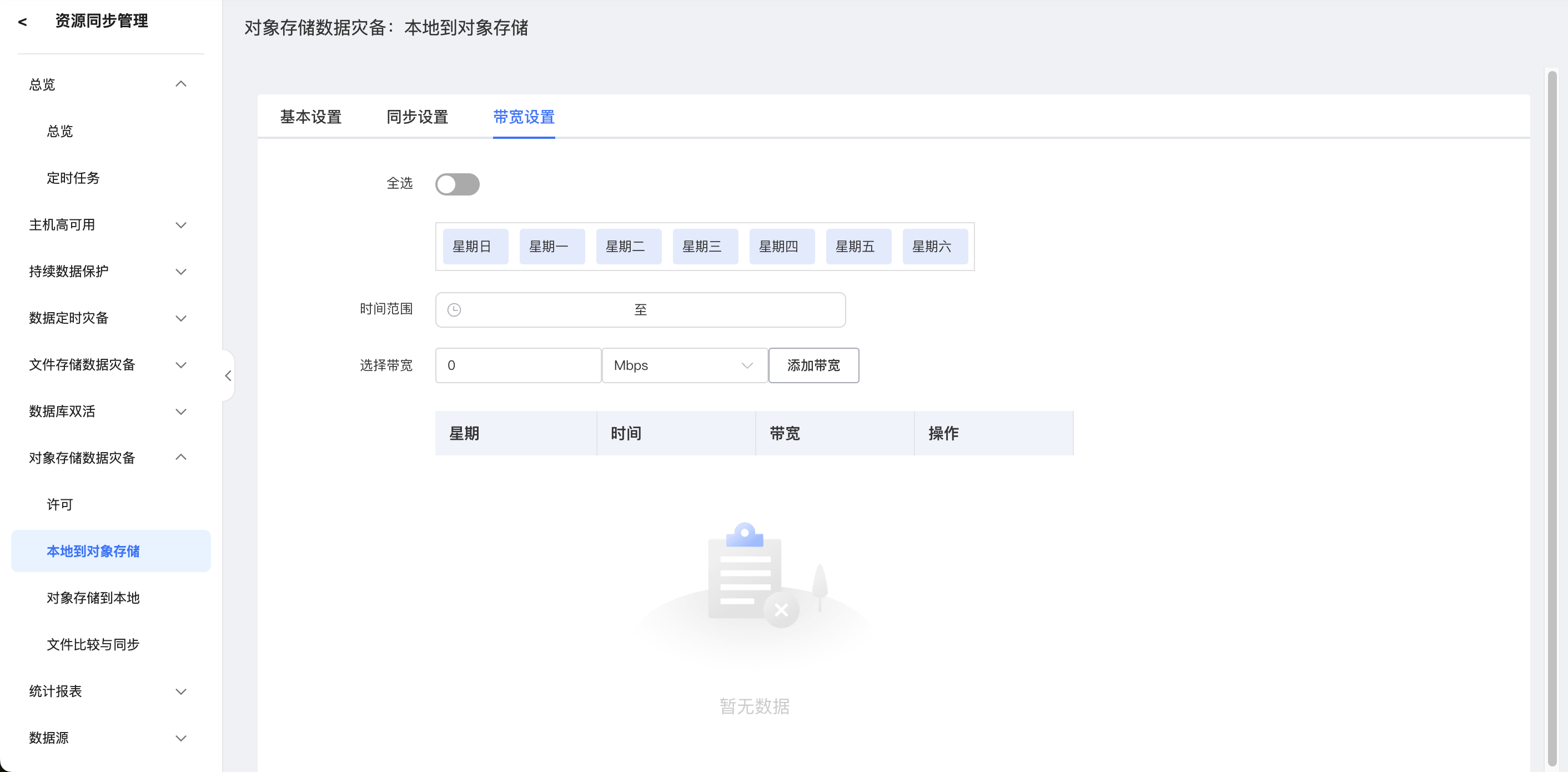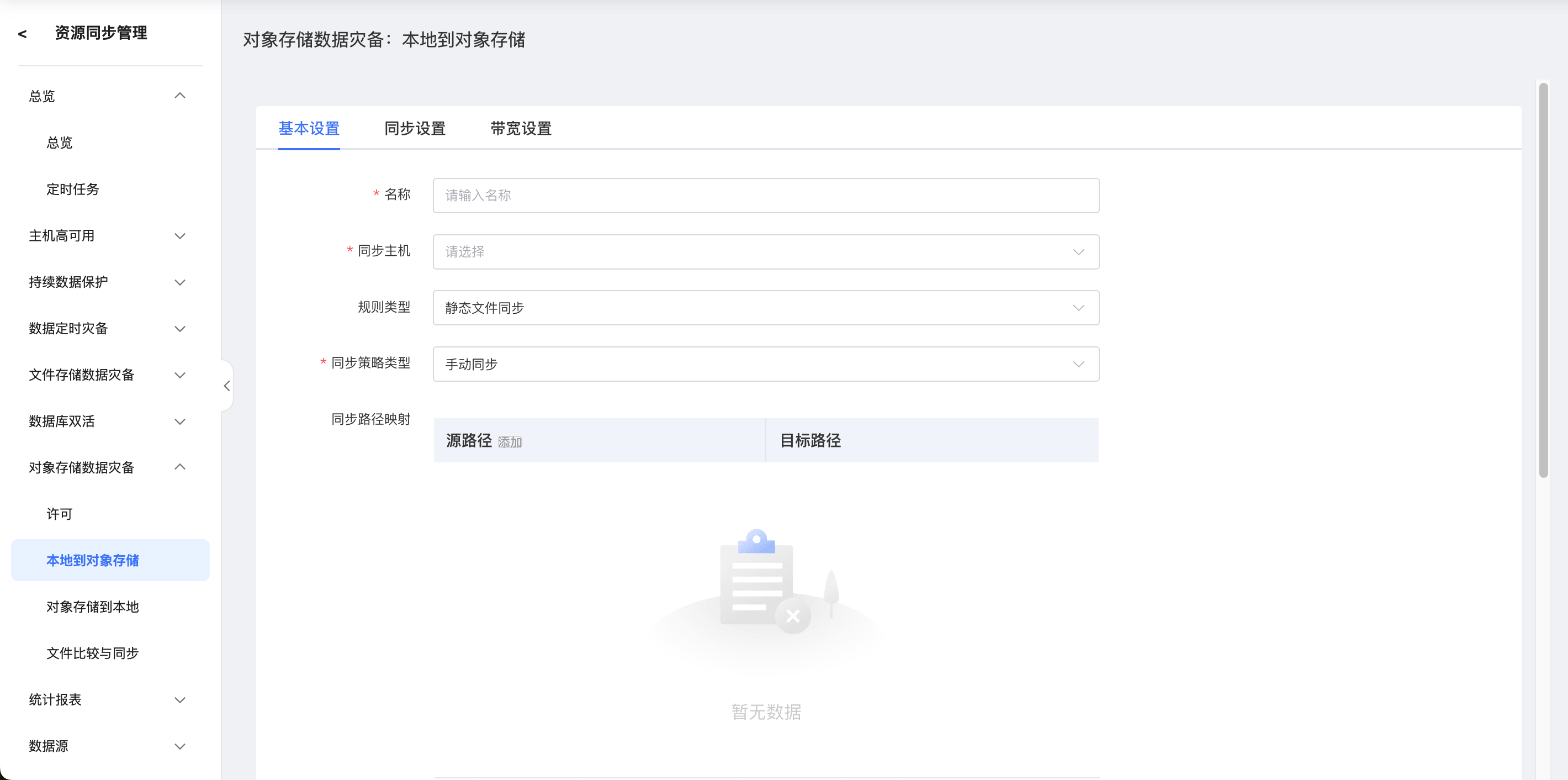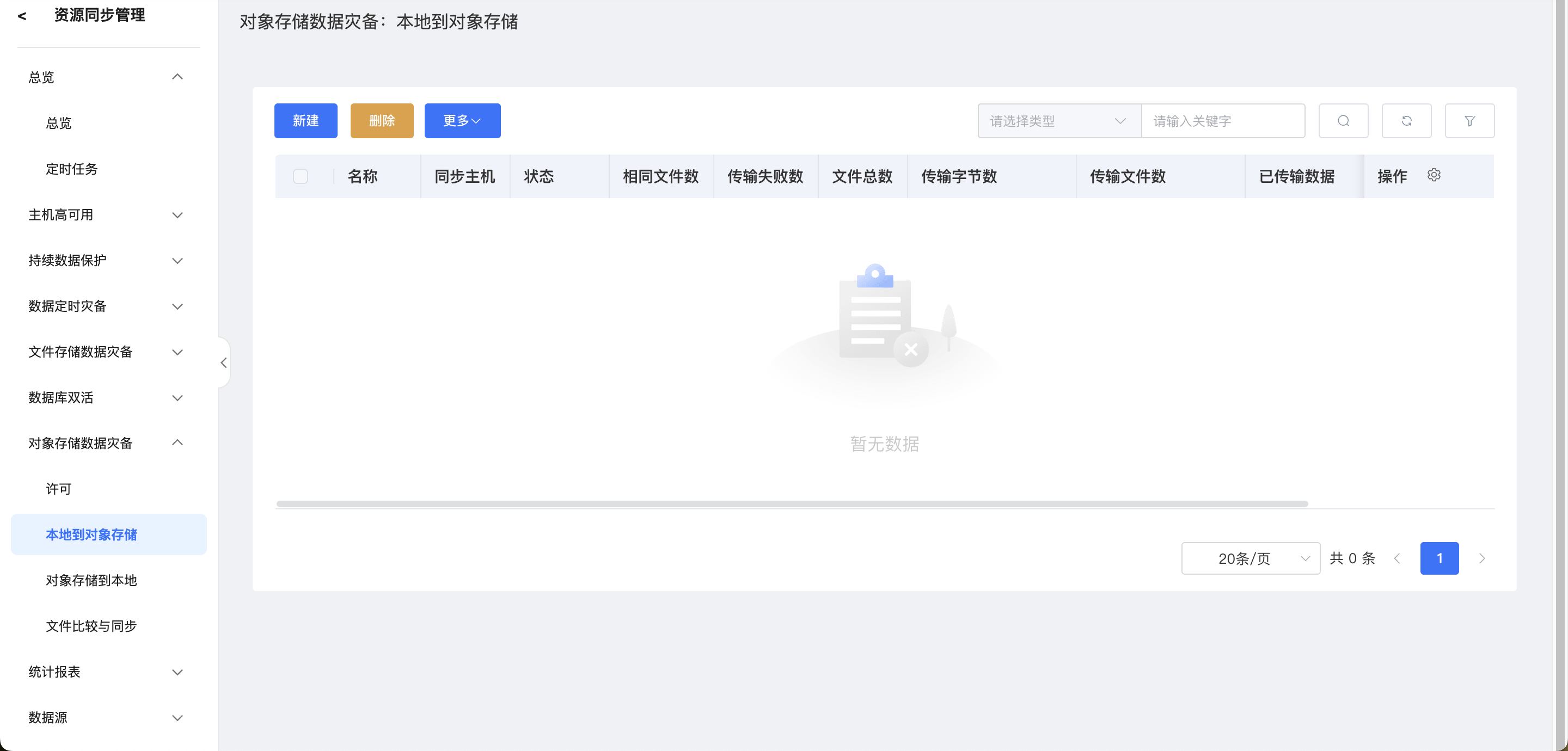 点击左侧菜单栏-“资源同步管理”-“对象存储数据灾备”-“本地到对象存储”,进入本地到对象存储列表页,点击“新建”按钮,进入新建页面。