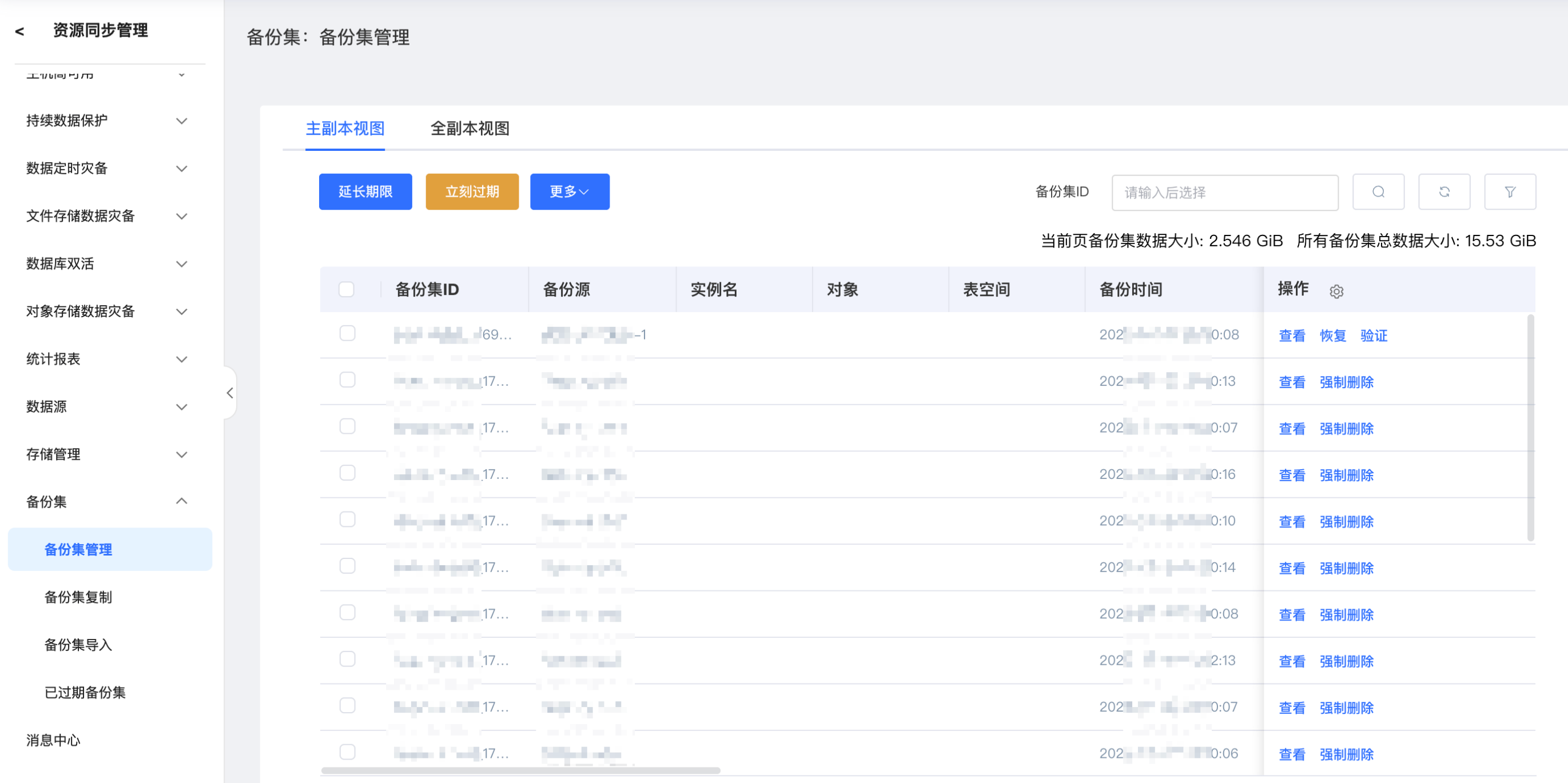 备份集管理分为主副本和全副本视图两个页面。