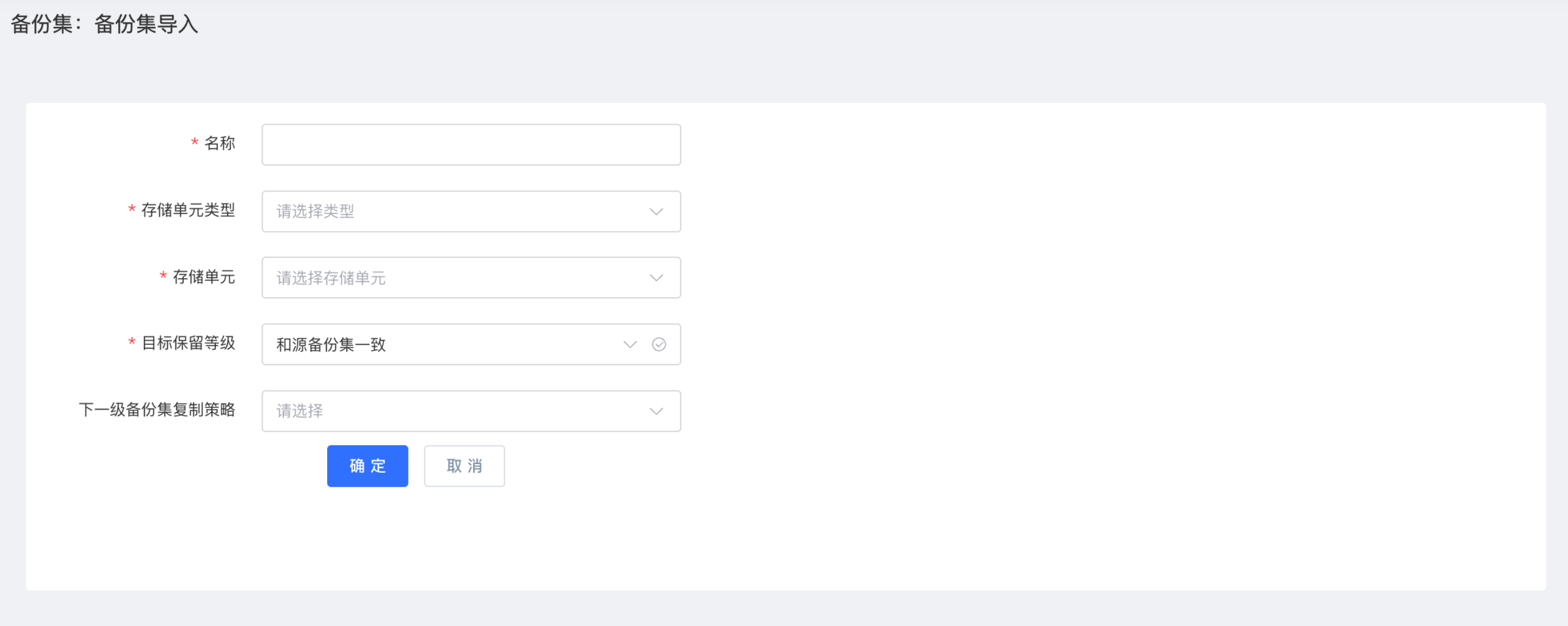 备份集导入规则页面主要用于定义备份集导入所涉及的存储单元类型、存储单元名称以及导入后的目标保留等级,将作为备份集导入创建的前置条件。执行备份集导入动作将关联备份集导入规则,否则无法导入成功。