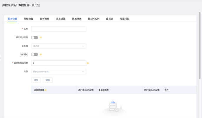 单击菜单栏“数据库双活”-“数据检查”-“表比较”,进入表比较规则界面。