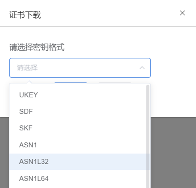 3.提交证书申请,申请成功后不要立即下载证书,在“证书下载 > 有效证书下载”中找到刚签发的证书,点击下载,选择不下载到ukey,密钥格式选择ASN1L32。
