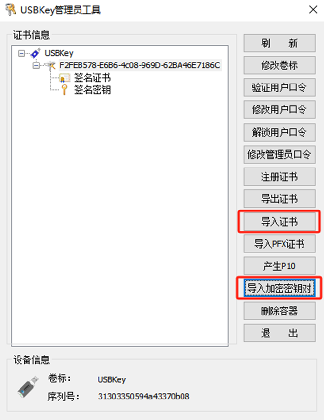 4.使用USBKey管理员工具,将下载的签名证书、加密证书和加密密钥分别使用导入证书、导入加密密钥对功能导入到UKEY中。