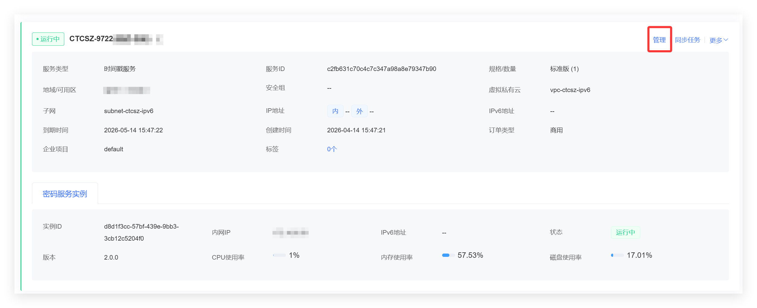 选择需要登录的时间戳服务实例,单击右上角的“管理”,进入实例登录页面,选择登录方式。