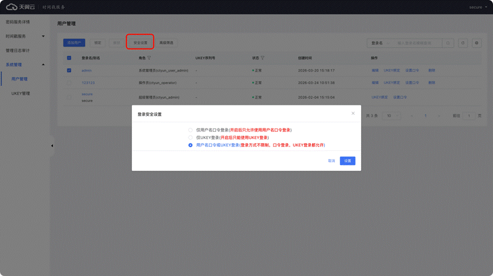 用户名口令或UKEY登录(登录方式不限制,口令登录,UKEY登录都允许)